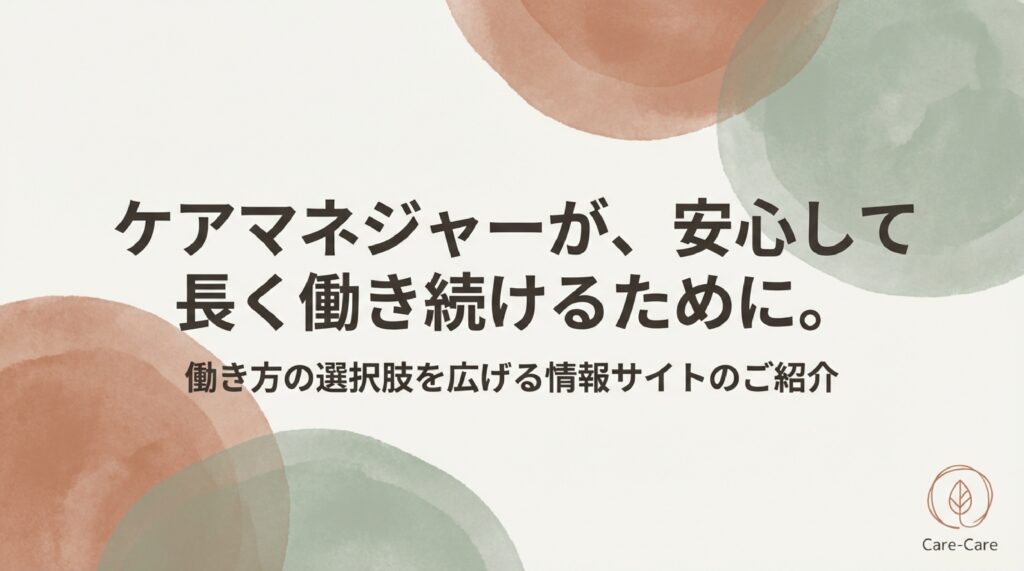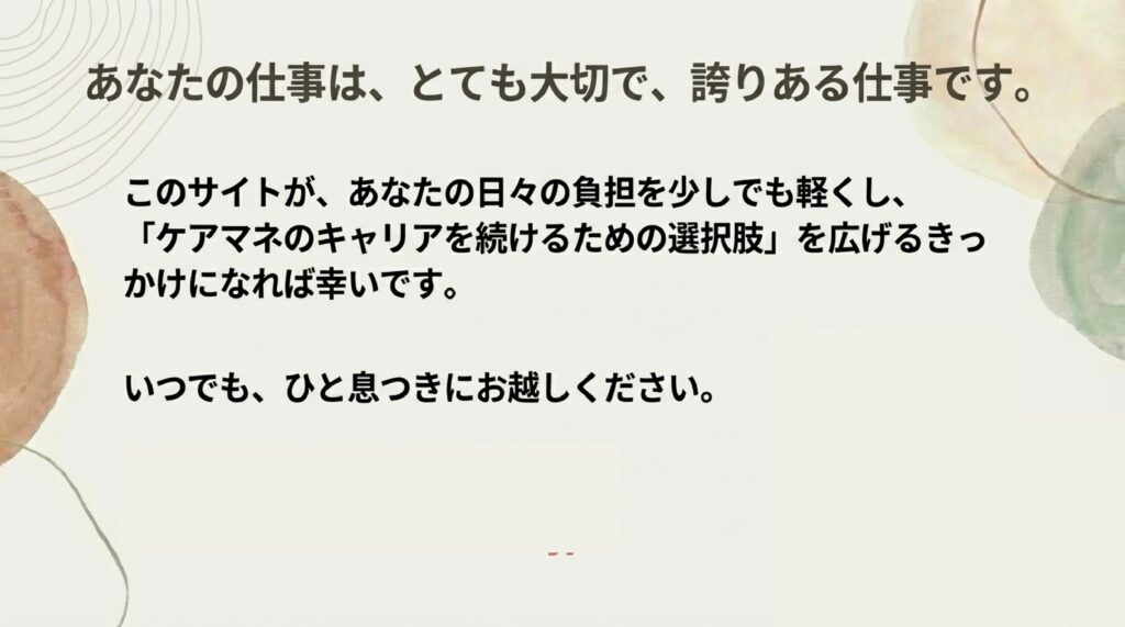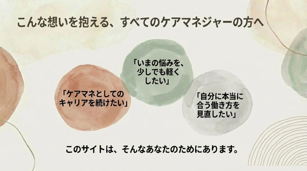 そこで私は、**ケアマネが安心して働くためのヒントや選択肢を知るための「情報の場」**として、このサイトを作りました。