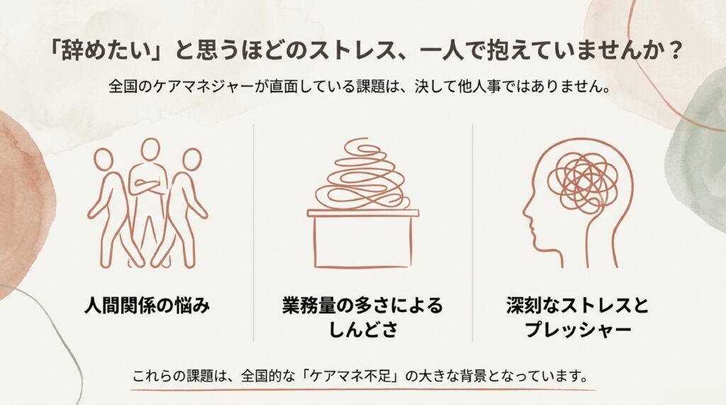 ケアマネジメント業務に携わりながら、日々「ケアマネ不足」や「現場のストレスの大きさ」を肌で感じています。