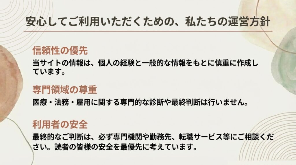 このサイトでは、私自身の経験をもとに、働き方や職場環境に関する一般的な情報をわかりやすくお届けしています。